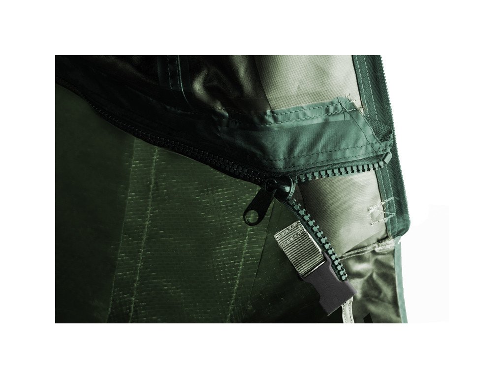 Bonusem navíc oproti předchozí generaci je zipovatelná podlaha. Po celém vnitřním obvodu je několik cm nad zemí všitý zip, díky kterému je zamezeno pronikání hmyzu, hlodavců či vody do bivaku. Pro snadnější stavění bivaku má podlaha označený vstup. K bivaku je možné dokoupit přehoz, který je ze stejného materiálu jako bivak. Jeho osazením na bivak získáte pod kšiltem dalších uzavřených cca 40cm před bivakem. Přehoz navíc zlepší tepelně izolační vlastnosti bivaku. Bivak Delphin YURTA NEO nabízí maximální možný komfort a uspokojí i ty nejnáročnější rybáře!