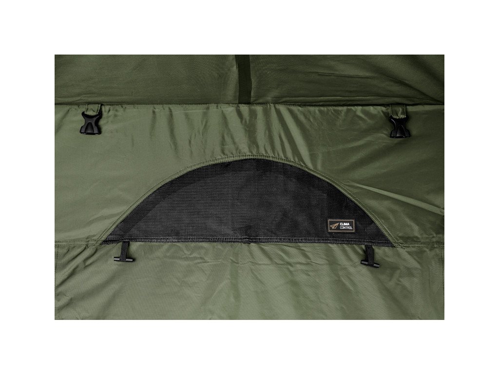 V přední části se kromě dveří nacházejí také dvě okna. Obě jsou moskytiérová s možností transparentních fóliových oken, nebo možností plné textilie. Fóliová okna jsou součástí balení, a tak nemusíte dokupovat nic navíc! U modelu YURTA NEO jsme však mysleli i na lepší odvětrání bivaku a aplikovali jsme něj náš sofistikovaný systém CLIMA CONTROL. Tento systém je tvořen dvěma větráky na protilehlých stranách (nad vstupními dveřmi a nad zadním oknem). Díky tomuto důmyslnému systému lze zajistit cirkulaci vzduchu ve vnitřním prostoru bivaku v době, kdy není možné větrat pomocí velkých oken. Určitě ho oceníte zejména v noci, kdy výrazně napomáhá snižovat kondenzaci na vnitřních stěnách. Celý systém je navíc jednoduše ovladatelný zevnitř bivaku.
