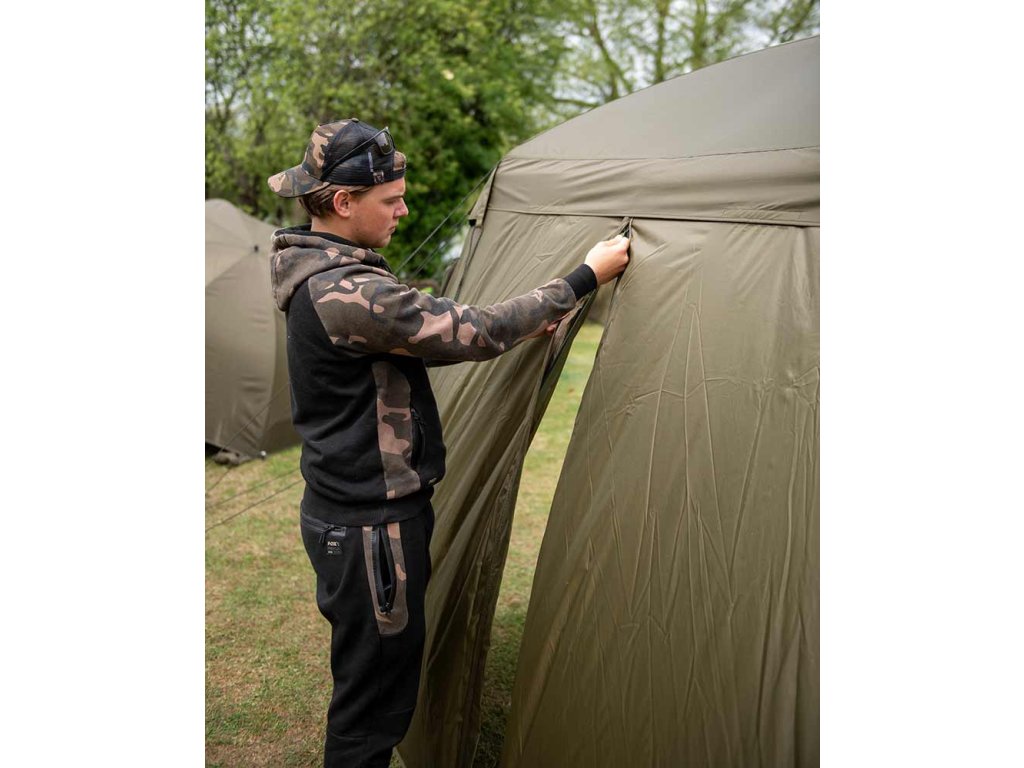 Díky systému nafukovacích trubic jej snadno a rychle nafouknete a kolíky zajistíte do země. Přístřešek je vyrobený z velmi odolné polyesterové tkaniny Fox Khaki s vodním sloupcem 8 000 mm, která poskytuje optimální ochranu před sluncem a teplem díky vnitřní vrstvě „Black Out“ na střešním panelu. Přístřešek je velmi všestranný je vybavený odnímatelnými dveřmi a bočními panely poskytuje různé možnosti větracích oken, zadní vchod lze využít k prodloužení bivaku nebo deštníku.