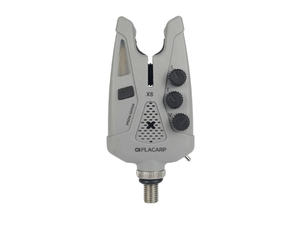 České signalizátory záběru FLACARP X8 vycházejí z oblíbeného modelu X7 a přidávají množství užitečných funkcí. Kromě osvědčeného designu, velmi vysoké mechanické odolnosti, precizního snímače odvíjení vlasce s potahem již od 1,5mm v obou směrech a v neposlední řadě napájení běžnými tužkovými články AAA, byly přidány nové funkce: režim potlačení falešných poplachů (např. při rybolovu v nepříznivém počasí nebo ze člunu), noční poziční světlo na swingeru, širší rozsah regulace délky potahu vlasce od 1,5mm až do 30cm, vylepšený zvuk padáku pro jednoznačné rozlišení směru odvíjení vlasce, širší rozsah nastavení barev LED a další vylepšení.