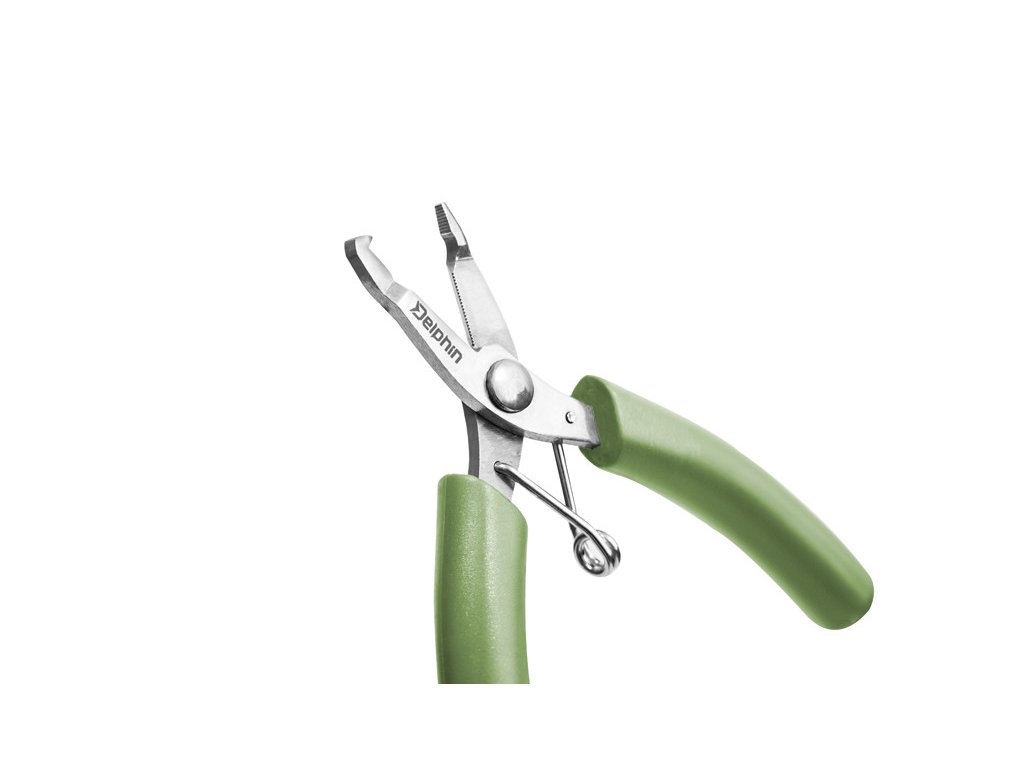 Praktické multifunkční kleště, vyrobené z nerezové oceli s gumovým potahem na madlech, pro pohodlnou manipulaci. Delphin MINI si hravě poradí se stříháním splétaných šňůr, vlasců, ale i aramidového (kevlarového) vlákna. Mikrozoubky na vnitřní straně čelistí slouží k přidržení rybářské šňůry a k následnému hladkému odstřižení. Kleště je možné využít také k rozdělení SPLIT RINGS kroužků, či upevnění vyvažovacího olůvka. Díky své univerzálnosti je lze využít při všech rybolovných technikách.