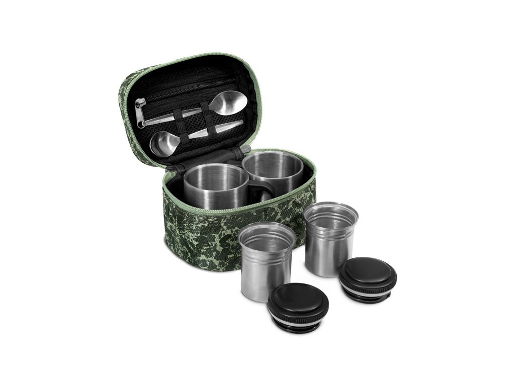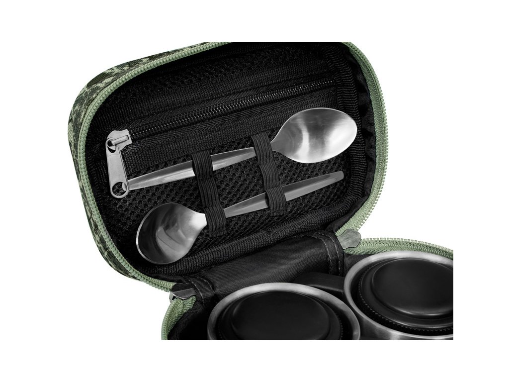 Rozměrem malý, obsahem velký – takový je Delphin COTEA. Produkt s malými transportními rozměry, díky čemuž nezabere ve výbavě téměř žádné místo. Přesto ukrývá sadu, která potěší každého, kdo si u vody rád vychutná dobrou kávu nebo teplý čaj. COTEA obsahuje dva kvalitní nerezové hrníčky, dvě čajové lžičky a také dvě uzavíratelné nerezové nádobky, které poslouží například pro cukr a kávu. Samotná taštička disponuje malou síťovanou kapsou, která bez problémů pojme dostatečnou zásobu čajových sáčků. Navíc je opatřena kvalitními zipy, přičemž ten vnější je vybaven praktickým taháčkem s logem firmy Delphin. COTEA je designováno v jedinečné C2G kamufláži s efektním piktogramem definujícím využití tohoto zajímavého produktu.