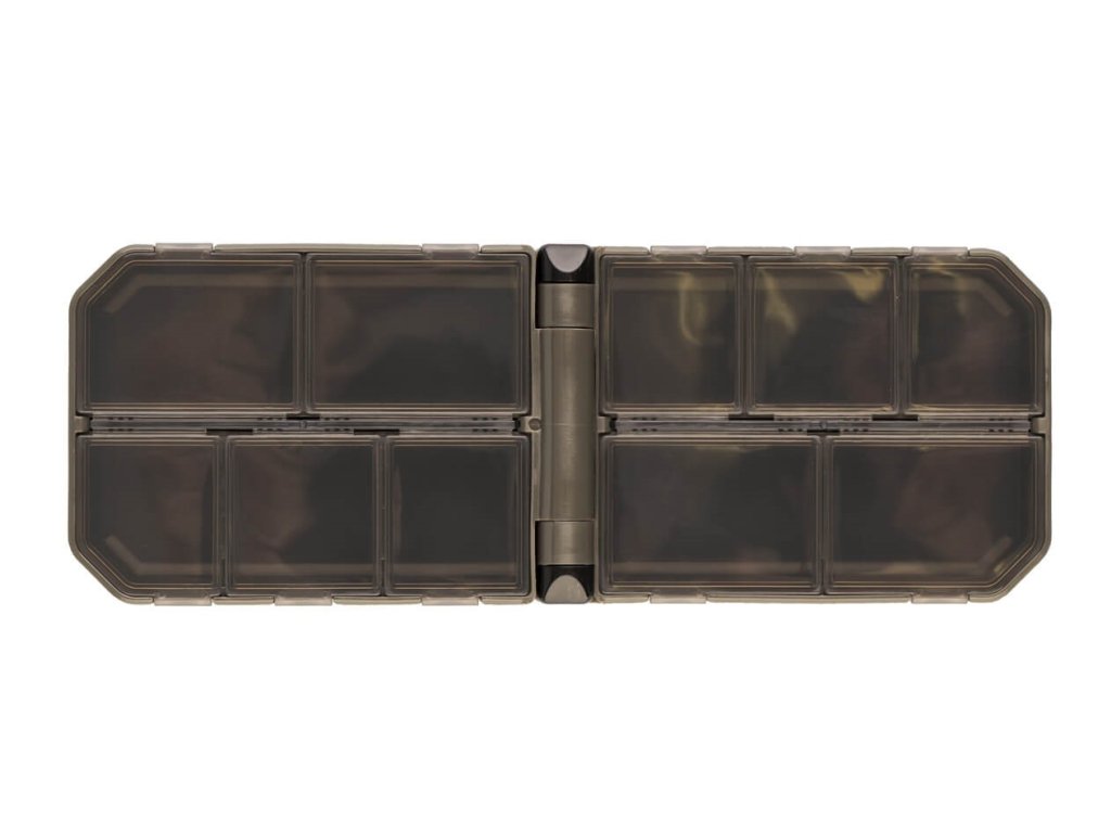 ZFISH Mini Double Box M je praktická oboustranná krabička/organizér od české značky ZFISH. Tento kompaktní box disponuje 10-ti samostatně uzavíratelnými přihrádkami s čirými krytem, takže snadno a ihned vidíte kam a pro co sáhnout. Bezpečné uzavírání, nebo nechtěné otevření zajišťují velice pevné panty. Jednoduchý a čistý design se zkosenými a oblými hranami nejen skvěle vypadá, ale díky oblým tvarům je i samotná manipulace mnohem příjemnější. Výborný dojem už jen podtrhují odolné materiály a komponenty ve velmi elegantním, temně olivově zeleném provedení. Tento kompaktní box je například vhodný na nejdrobnější bižuterii a příslušenství, které potřebujete mít vždy po ruce, ideálně někde v kapse.Kvalitní, kompaktní, oboustranný tackle box/organizér