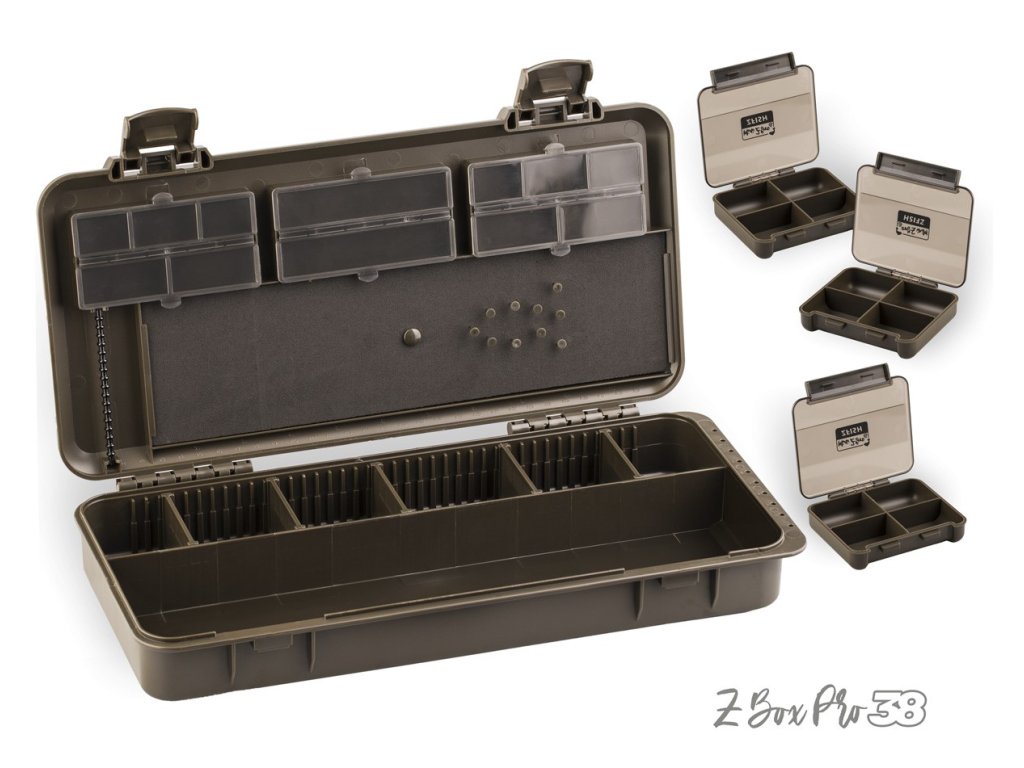 ZFISH Z-Box PRO 38 je praktický a univerzální tackle box od české značky ZFISH. Tento šikovný organizér je kompaktnější verzí modelu PRO 45 a disponuje 38-mi přihrádkami z nichž většina je nastavitelná díky vyjímatelným přepážkám. Bezpečné uzavření a nechtěné otevření zajišťují dva bytelné aretační klipy. Víko organizéru je opatřeno robustními, uzavíratelnými přihrádkami a dále nabízí kompletní zásobník na návazce s hrazdou pro háčky, pěnovou částí o velikosti 270 x80 mm a 10-ti kusy špendlíků a integrovaným pravítkem. Další vychytávkou u tohoto konkrétního modelu tackle boxu je integrovaná děrovaná lišta pro zavěšení hotových montáží umístěná na jedné z kratších stran spodní části boxu. Celkové rozměry boxu jsou 350 x165 cm s hloubkou 50 mm, takže spolehlivě pojme drobnou bižuterii včetně pomůcek pro samotné vázání návazců a montáží, jako jsou nůžky, kleště, jehly, utahovače uzlů apod. Nadstandardní výbavou tohoto pořadače jsou další 3 menší samostatné krabičky o velikosti 102 x 80 x 24 mm s 4, 6 a 8-mi přihrádkami. Jednoduchý a čistý design se zkosenými a oblými hranami nejen skvěle vypadá, ale díky oblým tvarům je i samotná manipulace mnohem příjemnější. Celkově výborný dojem už jen podtrhují odolné materiály, jednotlivé komponenty ve velmi elegantním, temně olivově zeleném provedení. Tento organizér využijete při většině rybolovných technik, především však při kaprařině a feederu.• Kvalitní, praktický tackle box/organizér 4v1 (3 menší samostatné přídavné krabičky součástí tackle boxu)