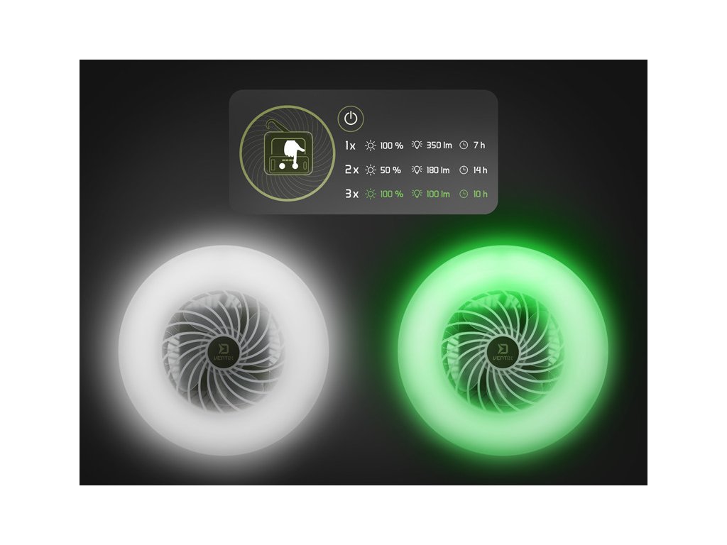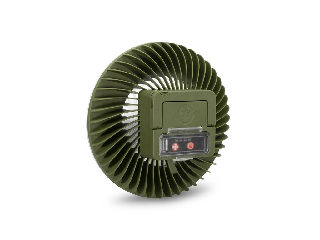 Stejně jako osvětlení, i ventilátor nabízí tři režimy intenzity, díky čemuž si jej jednoduše přizpůsobíte podle aktuálních teplotních podmínek. Prvním stisknutím se spustí ventilátor na nízkou intenzitu, při které baterie vydrží až 19 hodin. Druhý stisk zvýší výkon ventilátoru, přičemž výdrž se zkrátí na přibližně 14 hodin. Při nejvyšší intenzitě, aktivované třetím stiskem, ventilátor vydrží pracovat přibližně 11 hodin.