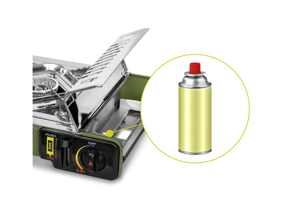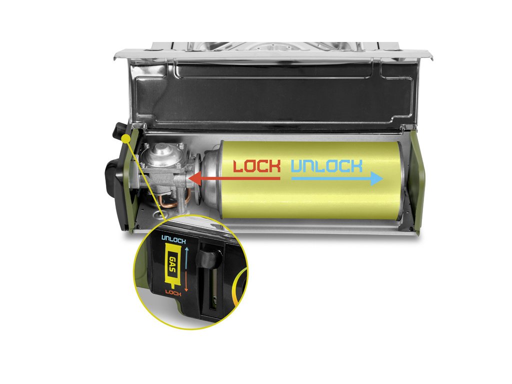 Vařič je napájen propan-butanovými kartušemi typu CP250 o objemu 400 ml. Disponuje tzv. two-stage safety systémem, díky kterému je používání maximálně bezpečné. Pro zapálení plamene je nejprve třeba kartuši zafixovat pomocí páčky na přední straně vařiče. Tím se výrazně snižuje riziko nechtěného úniku plynu nebo jeho samovolného uvolnění.